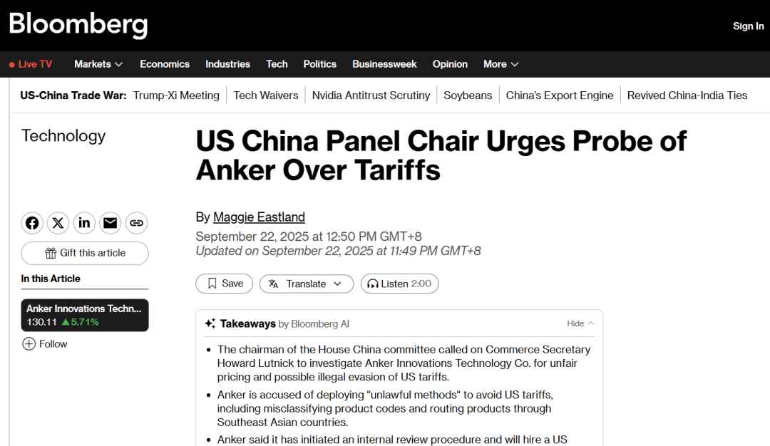 近日,美国众议院中国事务委员会的两党领袖联名致函美国商务部长,强烈呼吁对安克展开调查,指控其存在不公平竞争以及非法逃避美国关税的恶劣行为。
