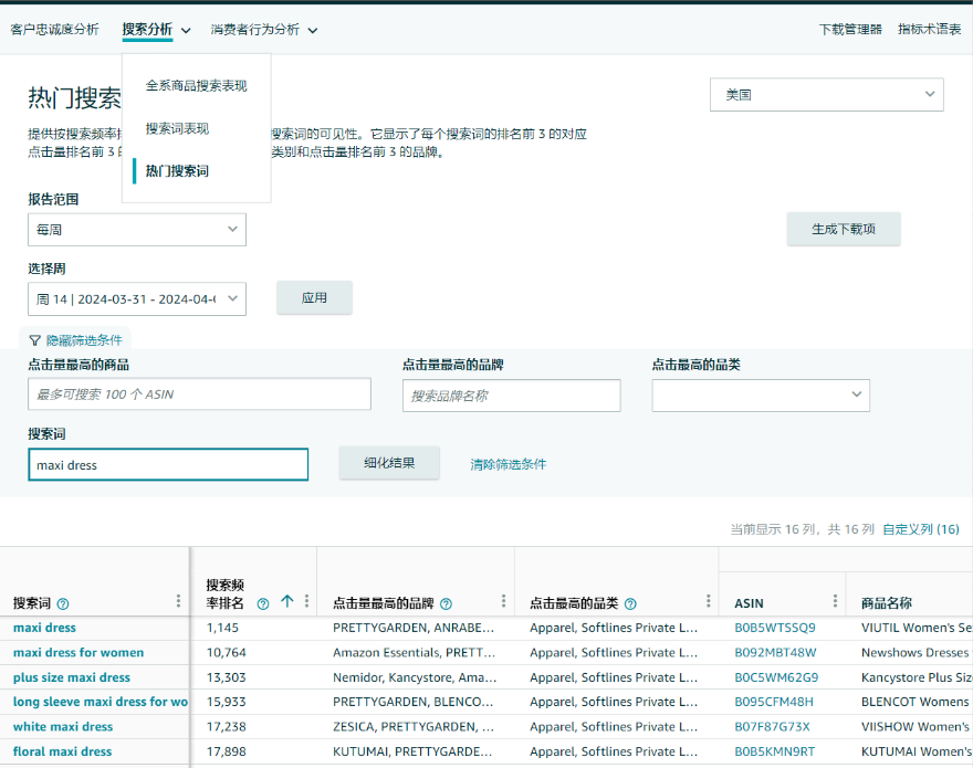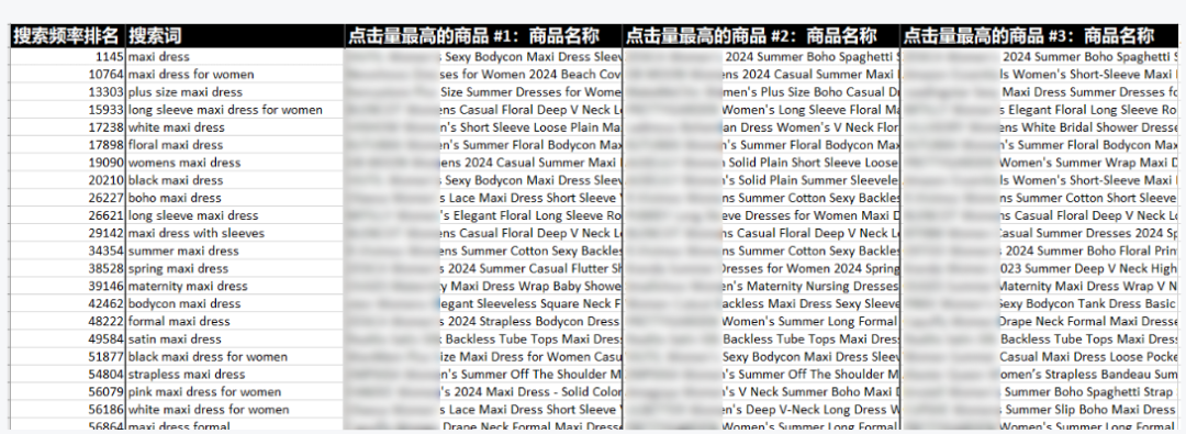 • 抓取高频词:使用ABA"热门搜索词"功能,输入您的核心关键词(如"women's maxi dress"),下载报告,找出您所在细分品类下最常被消费者搜索的词汇。