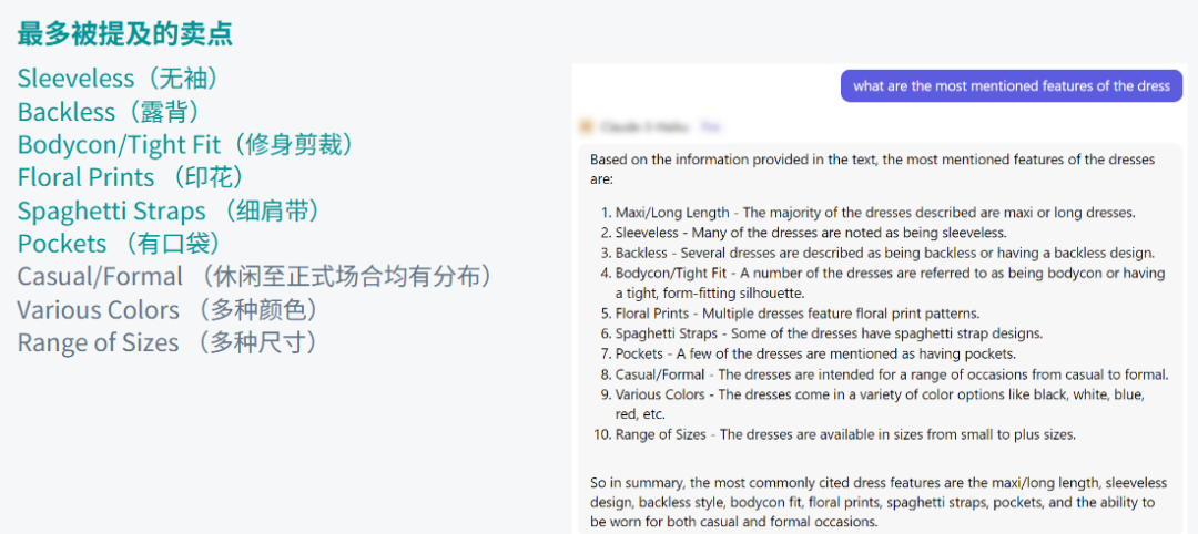 • 提炼核心卖点:分析报告中热卖商品的标题和描述,梳理出该品类下最多被提及的共通卖点(如:Sleeveless无袖, Floral Prints印花, Pockets口袋)。