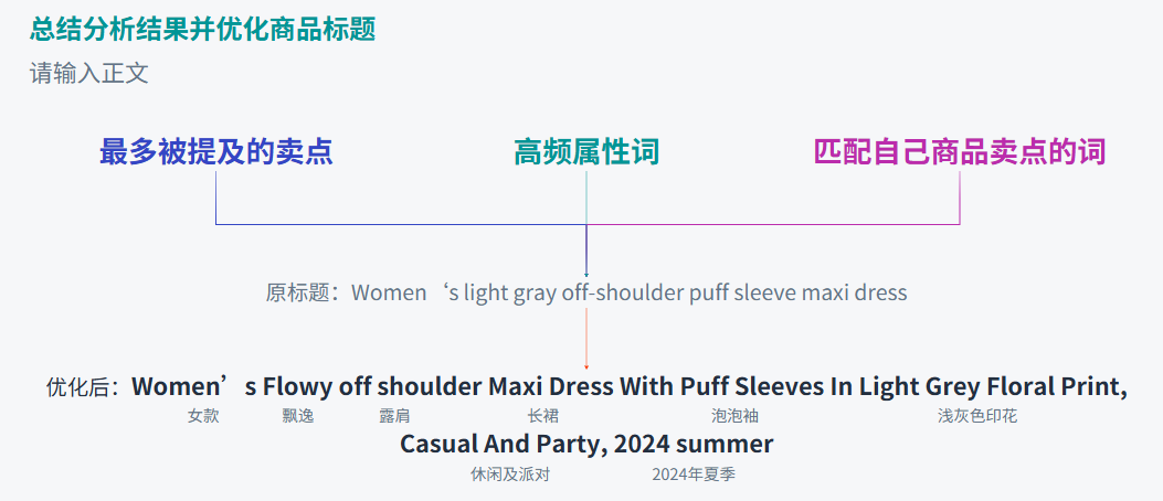 • 匹配自身优势:从高频词和核心卖点中,筛选出最能匹配您产品独特优势的关键词(如您的长裙特点是"Flowy飘逸"和"Puff Sleeves泡泡袖")。