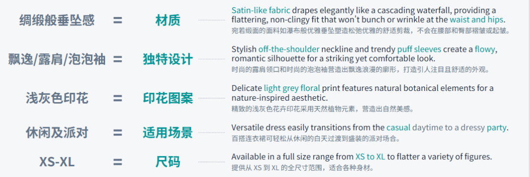 1. 避免宽泛:不要只说"高品质面料",要具体说明"Satin-like fabric drapes elegantly... providing a non-clingy fit that won't wrinkle"(像绸缎般优雅垂坠..........