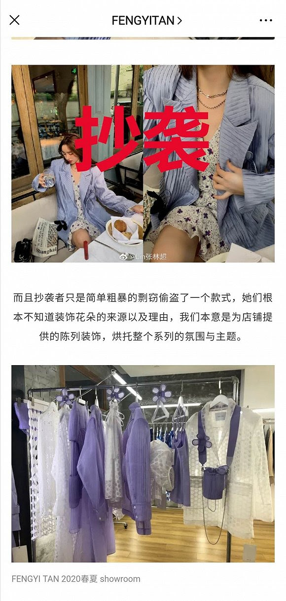 设计师品牌FENGYITAN、LUCENCY先后指控有数百万粉丝的网红品牌Lin Chao Zhang抄袭。