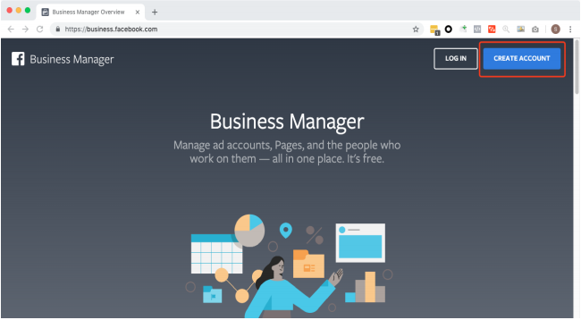 进入 https://business.facebook.com, 点击 Log In或Create Account(具备Facebook个人账号才能创建商务管理平台)