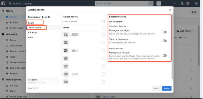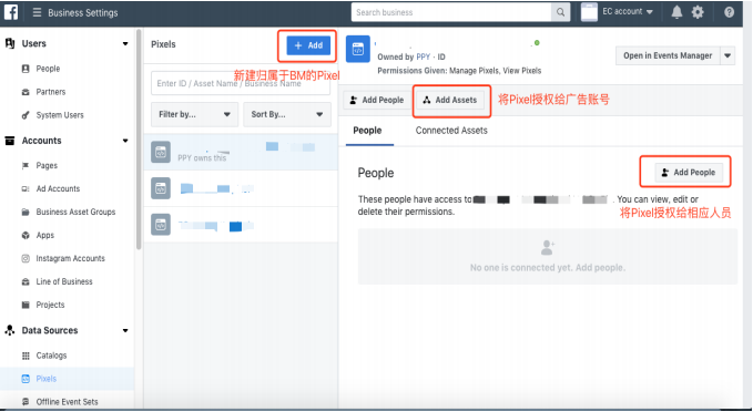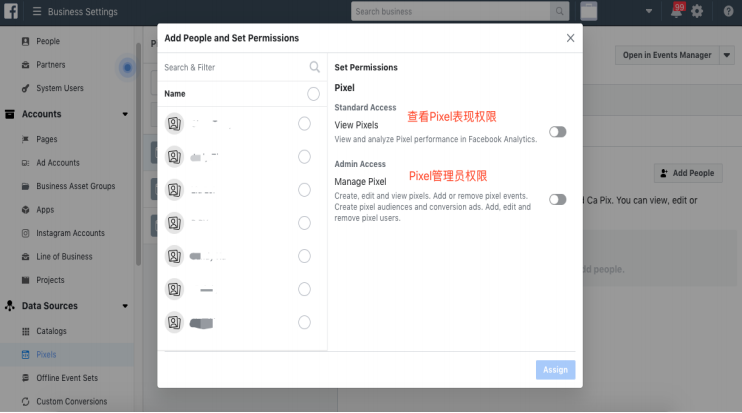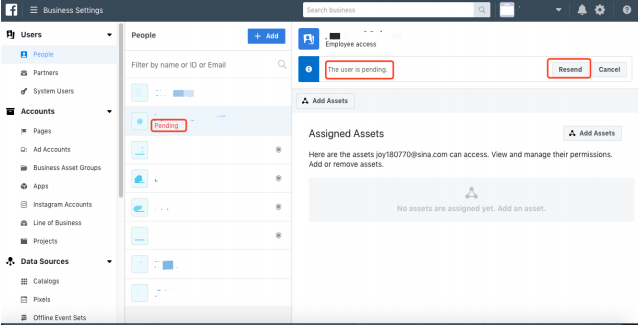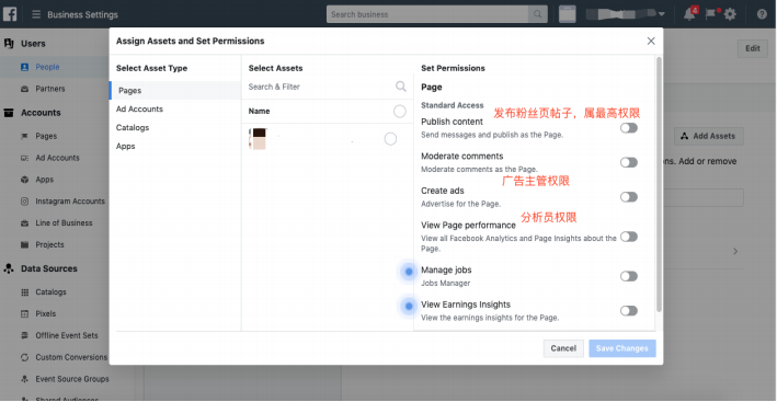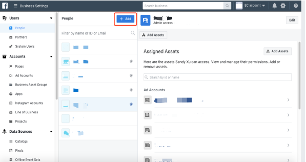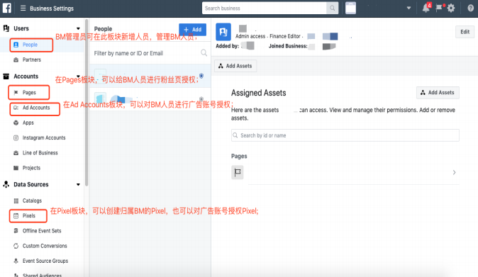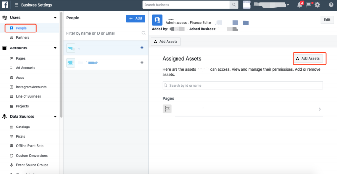 选择相应的人员,点击右边的 Add Assets 即可进行相应的粉丝页,广告账户,catalog,APP等授权;或者进入相应的板块,进行授权。