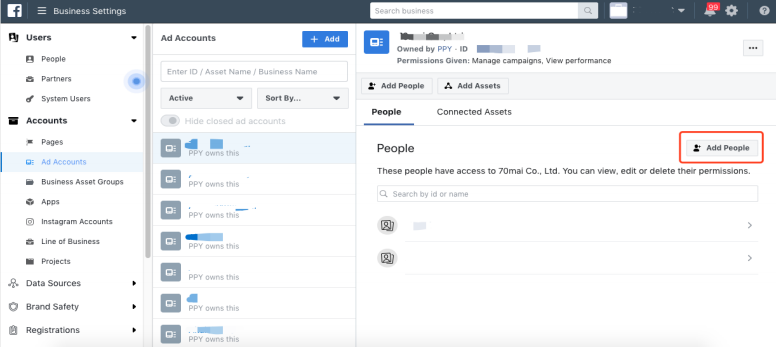 在 ad accounts 板块可对 BM 内所有的广告账号进行管理,比如将某个账号授权给 BM 内的人员,以及控制这个人对账号所拥有的权限