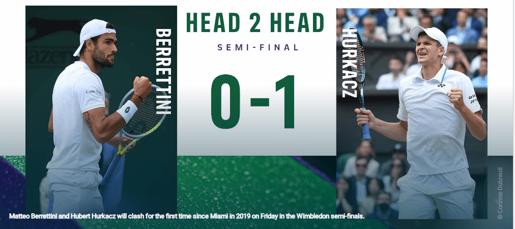 贝雷蒂尼半决赛对手是波兰新星胡尔卡奇,后者也是2018年开始征战职业赛,第二个赛季就在ATP1000系列印第安维尔斯站打进八强,但其在大满贯上始终没有出彩的战绩,2019年温网打进第三轮已经是最佳表现。进入到本赛季后胡尔卡奇"开窍"迎来大爆发,德拉海滩赛斩获一个冠军,尽管此后澳网首轮即遭淘汰出局,但在ATP1000系列迈阿密赛上,连胜多位大种子选手爆冷夺得冠军,也是职业生涯迄今最具分量的冠军头衔。迈阿密站后胡尔卡奇一度陷入低迷,从马德里开始连续五站赛事首轮出局,其中也包括法网首轮遭淘汰。进入到温网后胡尔卡奇再度找回好手感,连胜穆塞蒂、吉隆、布勃利克和梅德韦杰夫,八强则是爆冷3-0横扫瑞士天王费德勒,生涯首进大满贯半决赛,也是历史上第二位打进温网四强的波兰人(2013年扬诺维茨)。