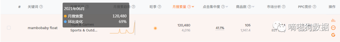 不难判断,在@PinkGerberGirl博主发出视频后,有很多TikTok的流量和用户外溢到站外的谷歌进行产品搜索并意图购买。其主要流量的来源多分布于美国和摩洛哥地区,产品在欧美地区十分受欢迎。该产品在亚马逊上同样也有售卖,下面是该产品的搜索词"mambobaby float"在亚马逊的搜索情况,其搜索热度最近也呈爆发式增长,仅六月份的搜索量就达12万以上。