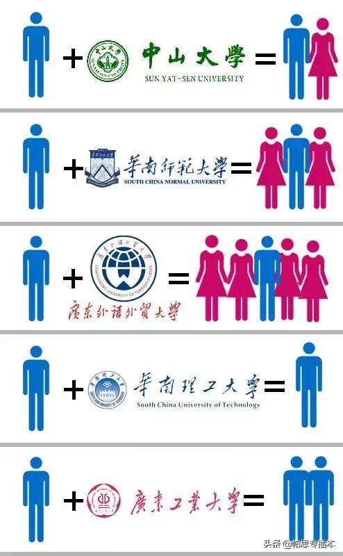 在大学时候谈一场甜甜的恋爱还是挺不错的,如果去了一所男女比例不协调的大学,那脱单难度系数可要直线上升!所以在挑选大学的时候,除了考虑学校的综合实力、学费、所在城市等因素,还有一个因素也是有些考生会考虑到的,那就是男女比例。男生应该都会喜欢广外吧所以如果你是冲着脱单来的,那么选对学校还是很重要的,具体我们来看看广东各高校的男女比例统计:不过,学校各个院系专业男女分布也是很不均衡的,所以即使男生去了一