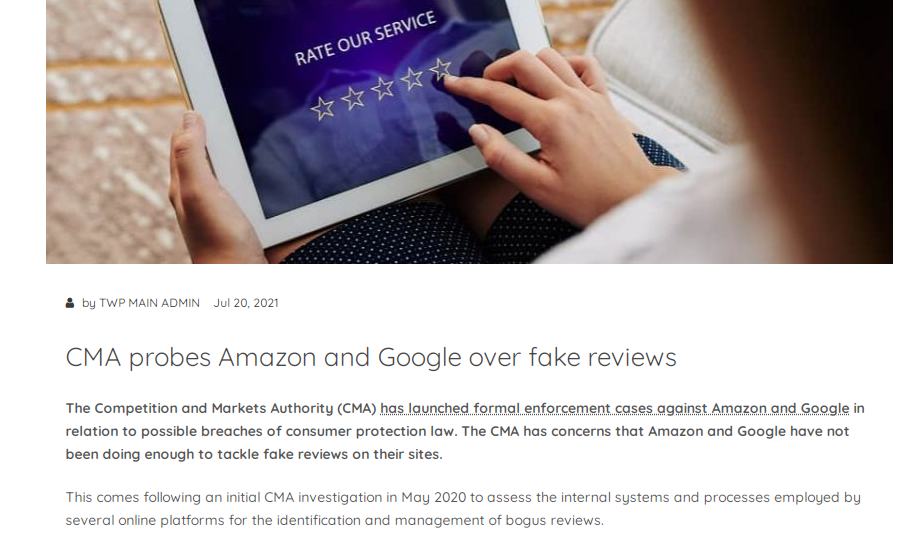 英国竞争和市场管理局(CMA)在5月末就展开了一项调查,主要目标是确定亚马逊和谷歌在处理虚假评方面的工作。比如如何审查虚假评论,以及确定存在虚假评论后,亚马逊有没有制裁相应的卖家。