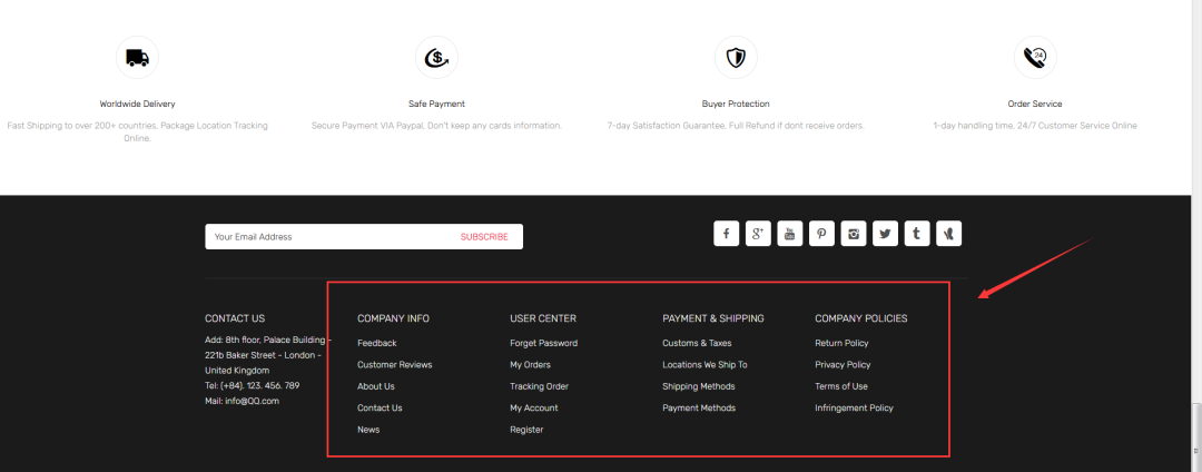 所以,我们要提前在网站里添加好相关的条款政策,避免不必要的损失,让买家详细了解到,如:退换货政策、发货时效、常见问题、隐私政策等。而通常,独立站卖家会将这些条款政策,显示在顶部导航或底部帮助中心里。