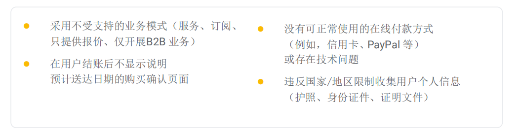 为了保证消费者购物体验,卖家需测试全部结账流程(一直测试到付款环节),确认用户可以完成实物商品购买且商品可以配送到实际地址。