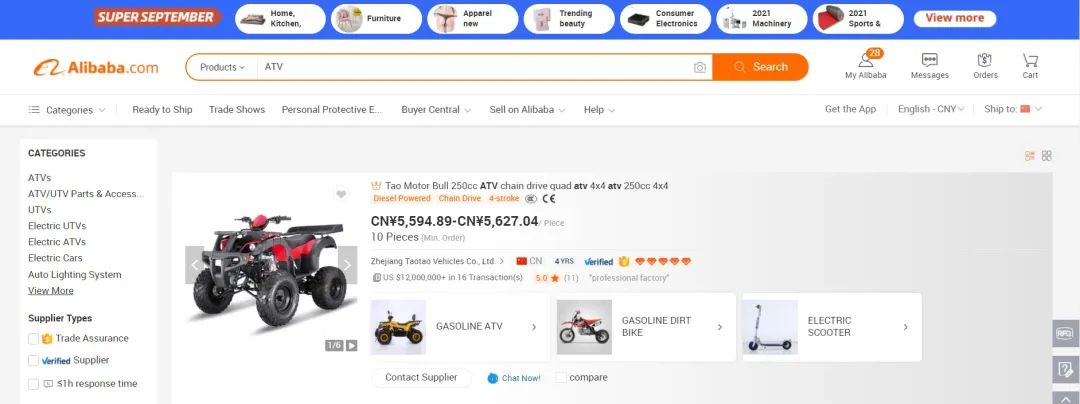 单周交易额同比增长4726%的现象级爆品,你见过吗?之前没见过没关系,在这个九月采购节,你可以看到了:全地形车,大家平时更习惯称呼为"沙滩车",在九月采购节首周大数据中,以交易额同比增长4726%的成绩,傲居榜首。这样惊人的数据背后,隐藏着什么商机的新趋势?抓住这波红利的商家,都做对了什么?TA的经验,你是否可以复制?带着这样的疑问,我们可以看看采购节迄今已达成500万美金以上订单的浙江涛涛车业股