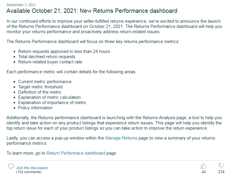 与此同时,亚马逊还会推出店铺退货分析工具,将为卖家深度解析店铺目前退货的状况和推荐一些改善建议。也会针对单个订单的退货缘由进行分析,帮助卖家解决退货问题。