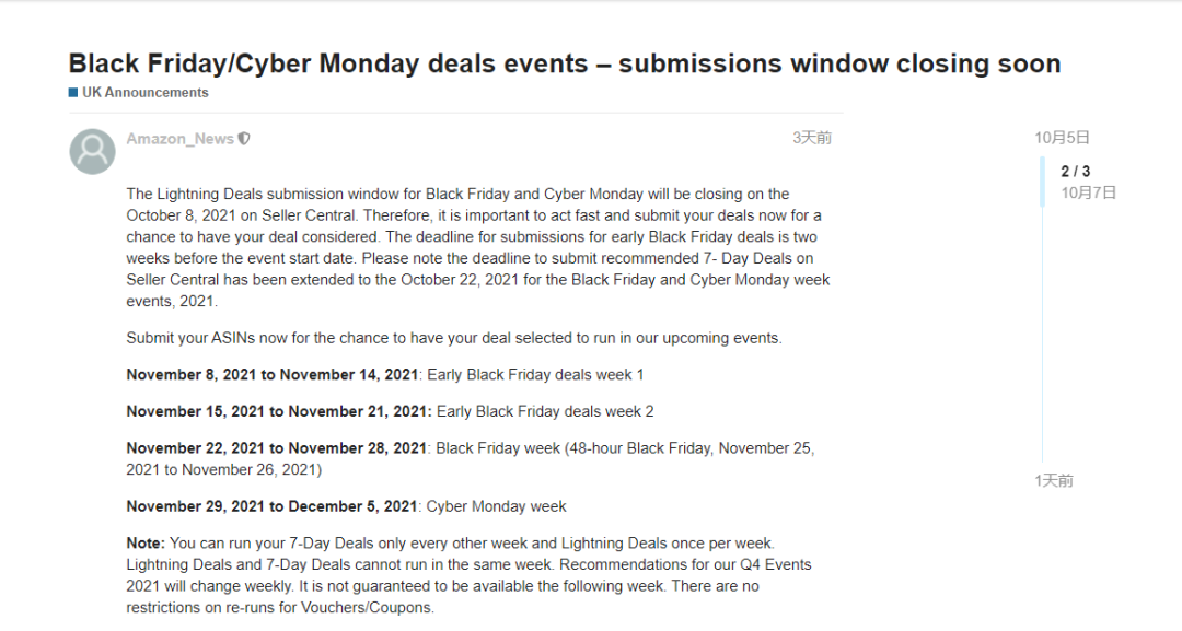 近日,亚马逊英国站发布了一则关于黑五、网一特卖活动的最新公告,公告指出,今年黑五、网一特卖活动的提报窗口即将关闭,有意愿参与本次活动的卖家需尽快登录卖家中心进行交易提报。