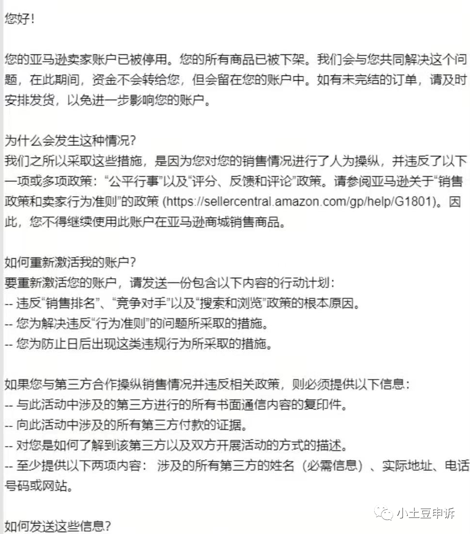 最近几个月,操纵销量被封店越来越多,部分卖家甚至因为该原因账号多次被封。据小土豆了解,有部分卖家账号被封后分不清操纵评论和操纵销量。封店邮件类型不一样,所对应的申诉方案也就不一样。这篇文章主要讲操纵销量类型,操纵评论之前的文章有很具体的讲过,这里就不再多说。首先,我们来看看操纵销量的邮件。怎么判断是不是操纵销量导致的账号被封?账号被封后查看绩效通知找到账号停用通知,看关键信息:我们之所以采取这些措