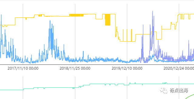 由上图所示,我们可以看出,在10月底~2月份该产品的销量会相对较高,过了这段时间后销量会开始波动,进入不稳定阶段,由此判断该产品为季节性产品,且该产品季节流量高峰期为:10月底~2月初。不过,存在部分竞品在非应季时期也能有较稳定销量的情况。