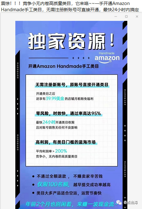 但要说到是不是必须要有独家渠道才能申请开通,那当然不是啦!今年有好多服务商在吆喝说这是一个毫无内卷的蓝海类目,鼓励大家去申请开通,这没毛病。但是他们宣称可用他们的独家资源去帮助大家申请,不通过全额退款,这就有点小问题了。所谓独家资源不过是信息差而已,Amazon Handmade这个项目完全是免费的,完全是可以自主申请的。有些钱能省则省吧......
