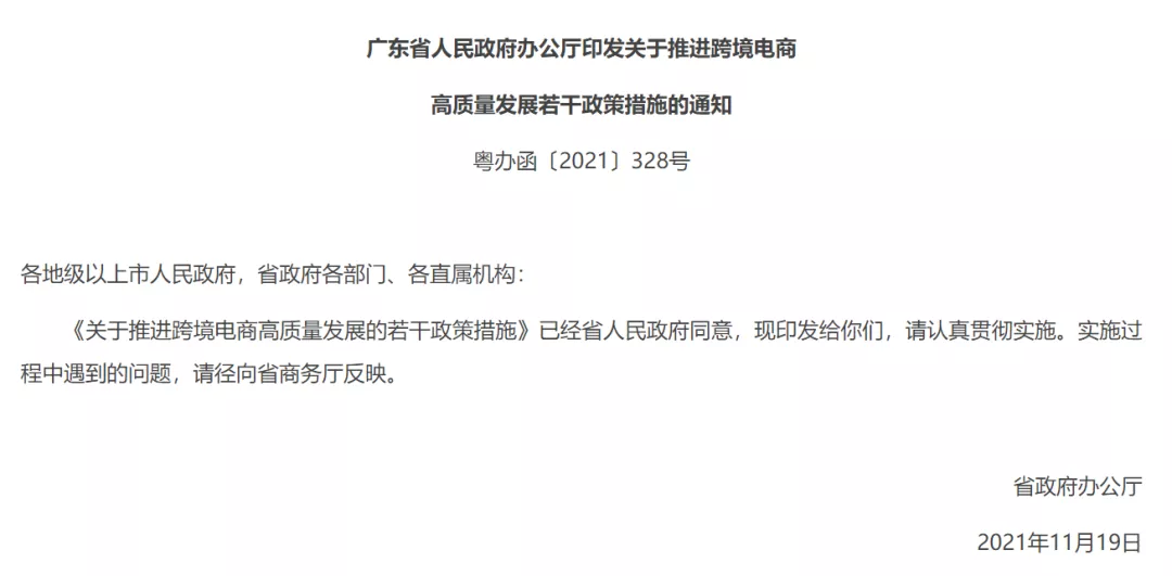 近日,为推动跨境电商产业跨越式发展,广东省人民政府办公厅印发《关于推进跨境电商高质量发展的若干政策措施》的通知。
