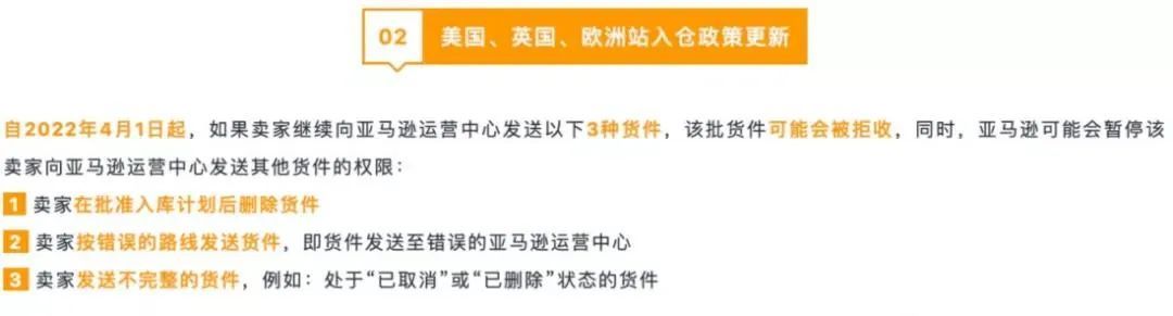 在亚马逊的官网中可以看到:自2022年4月1日起,如果卖家继续向亚马逊运营中心发送以下3种货件,该批货件可能会被拒收。
