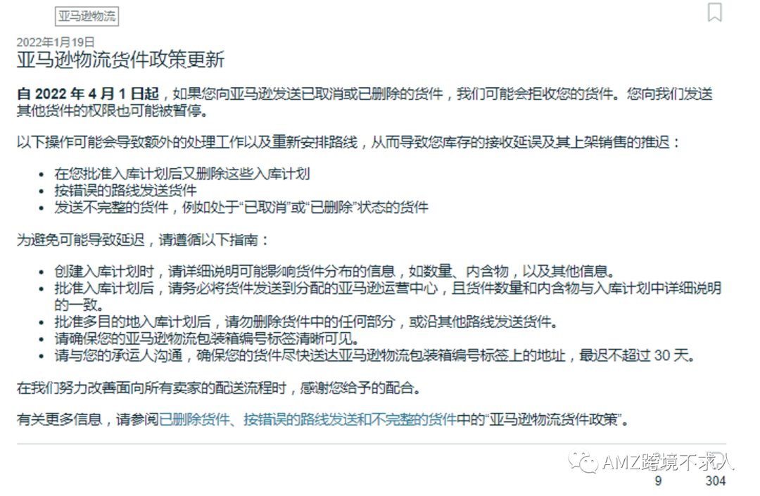 亚马逊官方出通知了,自2022年4月1日起,如果卖家向亚马逊发送已取消或已删除的货件,那么卖家的货件可能会被拒收。除此之外,作为违反政策的惩罚,卖家向亚马逊发送额外货物的能力也可能会被暂停。