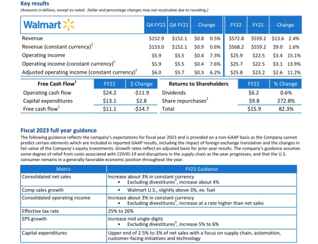 展望2023财年,沃尔玛预计营收将达到5884亿美元,每股盈利6.7美元,资本支出占净销售额的2.5%-3%。