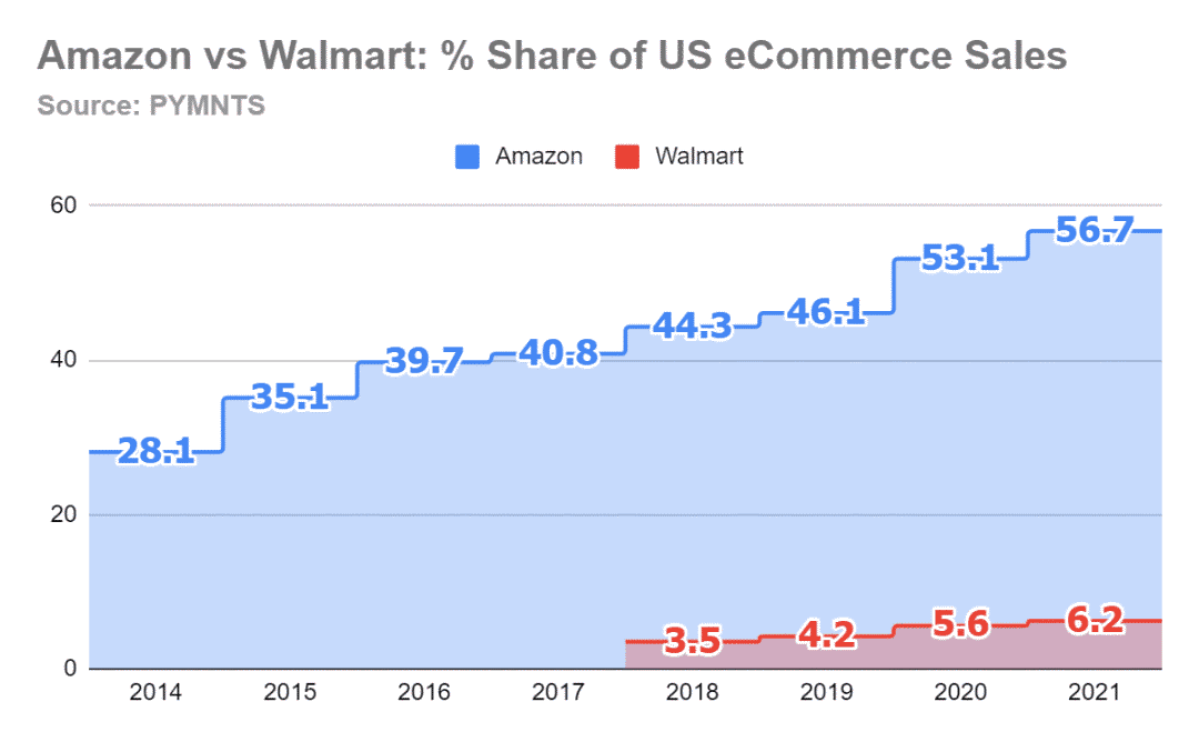亚马逊与沃尔玛的美国市场电商份额对比,来源:PYMNTS