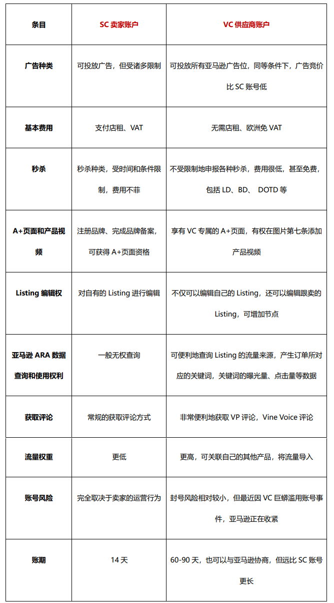 VC账号卖家与亚马逊是第一方的关系,SC卖家账号与亚马逊则是第三方的关系。