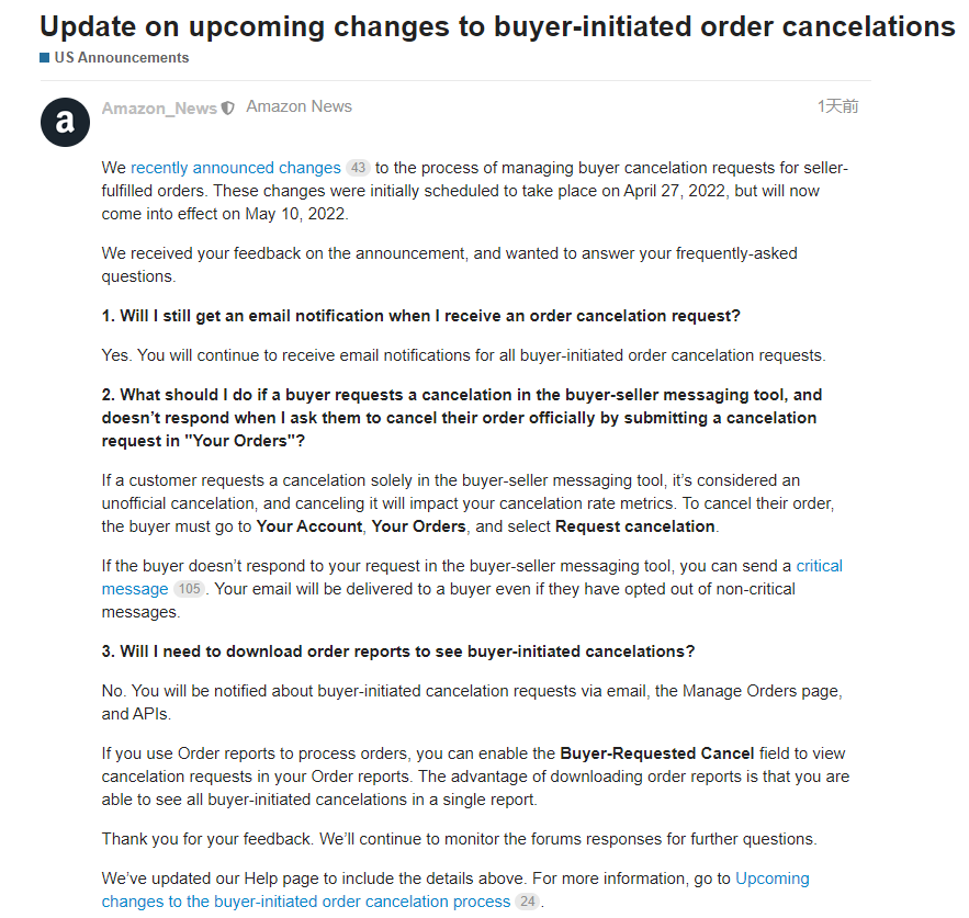 亚马逊美国站发布公告表示,原计划于2022年4月27日起更改自配送卖家管理买家取消订单的流程,将推迟至2022年5月10日实施。