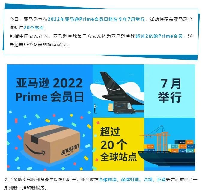 1.2022亚马逊Prime会员日定在7月;2.亚马逊卖家可通过实时聊天功能提交增值税相关问题;3.全球速卖通更新订单上网率规则;4.Shopee调整菲律宾海外仓店铺平台佣金;5.Lazada印尼站停用SellerPicks商家精选工具。 -亚马逊-2022亚马逊Prime会员日定在7月近日,亚马逊宣布2022年亚马逊Prime会员日将在今年7月举行,活动将覆盖亚马逊全球超过20个站点。包括中国卖家在内,亚马逊全球第三方卖家将为亚马逊全球超过2亿的Prime会员,送去涵盖各类商品的超值优惠。据介绍,为了帮助卖家顺利备战年度销售旺季,亚马逊在仓储物流、品牌打造、合规、运营等方面推出了一系列新举措和新服务。
