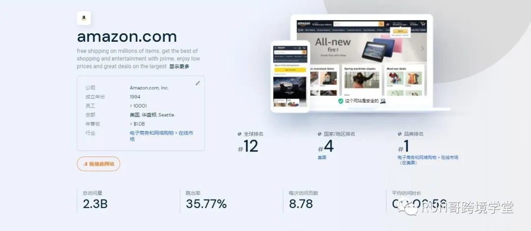 亚马逊美国站目前全球排名第11名,在美国排名第4名,在美国电商和购物类网站排名第1名。
