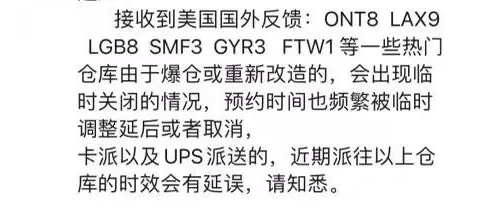 据悉,是因为ONT8、LAX9、LGB8、SMF3、GYR3、FTW1等一些热门仓库爆仓或重新改造,才会出现临时关闭的情况,预约时间也频繁被临时调整延后或取消。卡派以及UPS派送的,近期派送以上仓库的时效会出现延误。