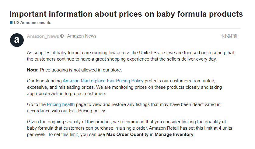 创蓝论坛获悉,亚马逊美国站发布公告称由于美国婴幼儿配方奶粉供应短缺,亚马逊严厉打击卖家哄抬物价的行为,并建议卖家对婴幼儿配方奶粉进行限制购买,以下是公告内容: