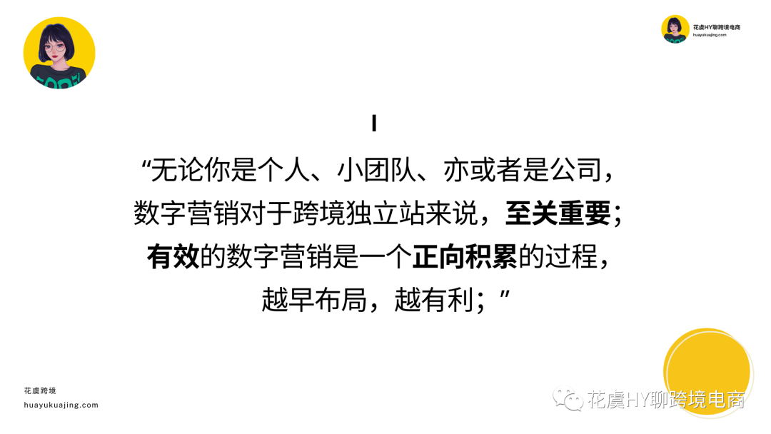 "无论你是个人、小团队、亦或者是公司,数字营销对于跨境独立站来说,至关重要;有效的数字营销是一个正向积累沉淀的过程,越早布局,越有利;"