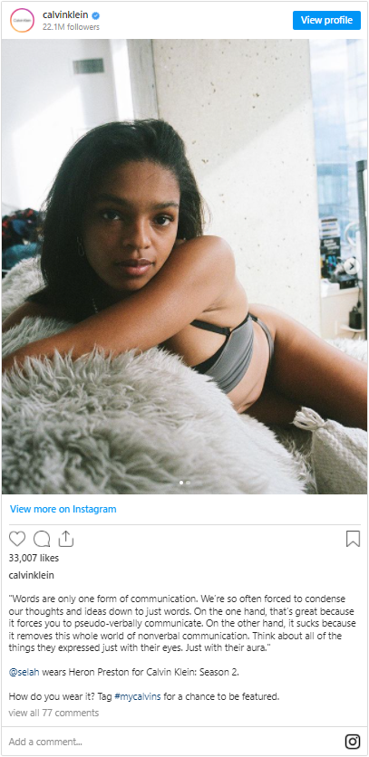 您的产品很可能会受到好评,并且您会收到有用的反馈和喜爱您品牌的人的认可。以下是Calvin Klein的用户生成内容示例。