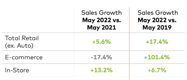 此外,与2021年同期相比,今年5月份加拿大在线销售额同比下降17.4%,与2019年同期相比,则增长了101.4%。主要原因是消费者重回实体店,网购热潮有所消退。