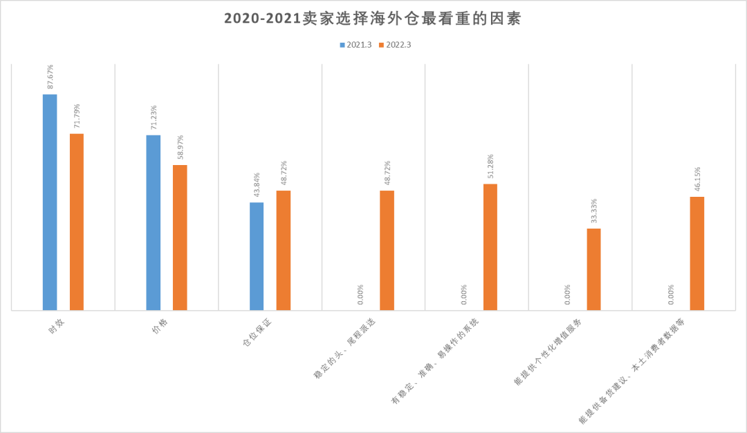 根据跨境眼《2022海外仓蓝皮书》数据显示,对比2022年与2021年调研的"卖家选择海外仓最看重的因素","时效与价格"依然蝉联榜首,但也有一些其他因素悄然发生了改变。