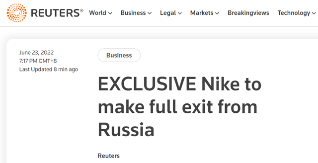 据路透社报道,当地时间23日,美国运动品牌耐克(Nike)在一份电子邮件声明中表示,在暂停俄罗斯业务约三个月后,该公司将全面退出俄罗斯。