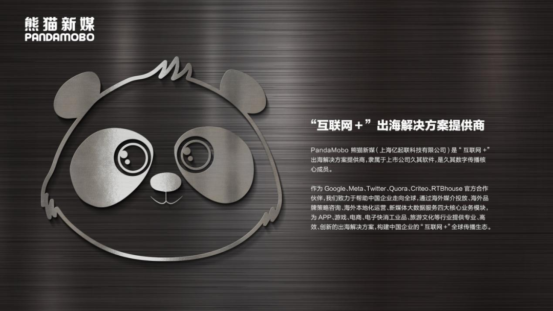 PandaMobo作为"互联网+"出海整合营销平台,隶属于上市公司久其软件,手握海外头部媒体平台核心代理资源,连续7年服务数千家中国大型名企、各行业跨境电商及零起步中小企业,有效帮助海量客户触达全球用户,打开国际市场,实现卖货与品牌两手抓、两手硬。