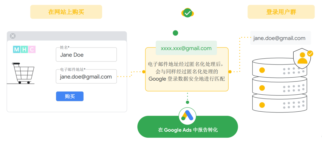 增强型转化在摒弃第三方cookies后,通过捕获广告主在转化页上收集的客户数据(例如电子邮件地址)并进行哈希处理,然后将其与 Google 登录用户的数据进行匹配,来追踪转化。