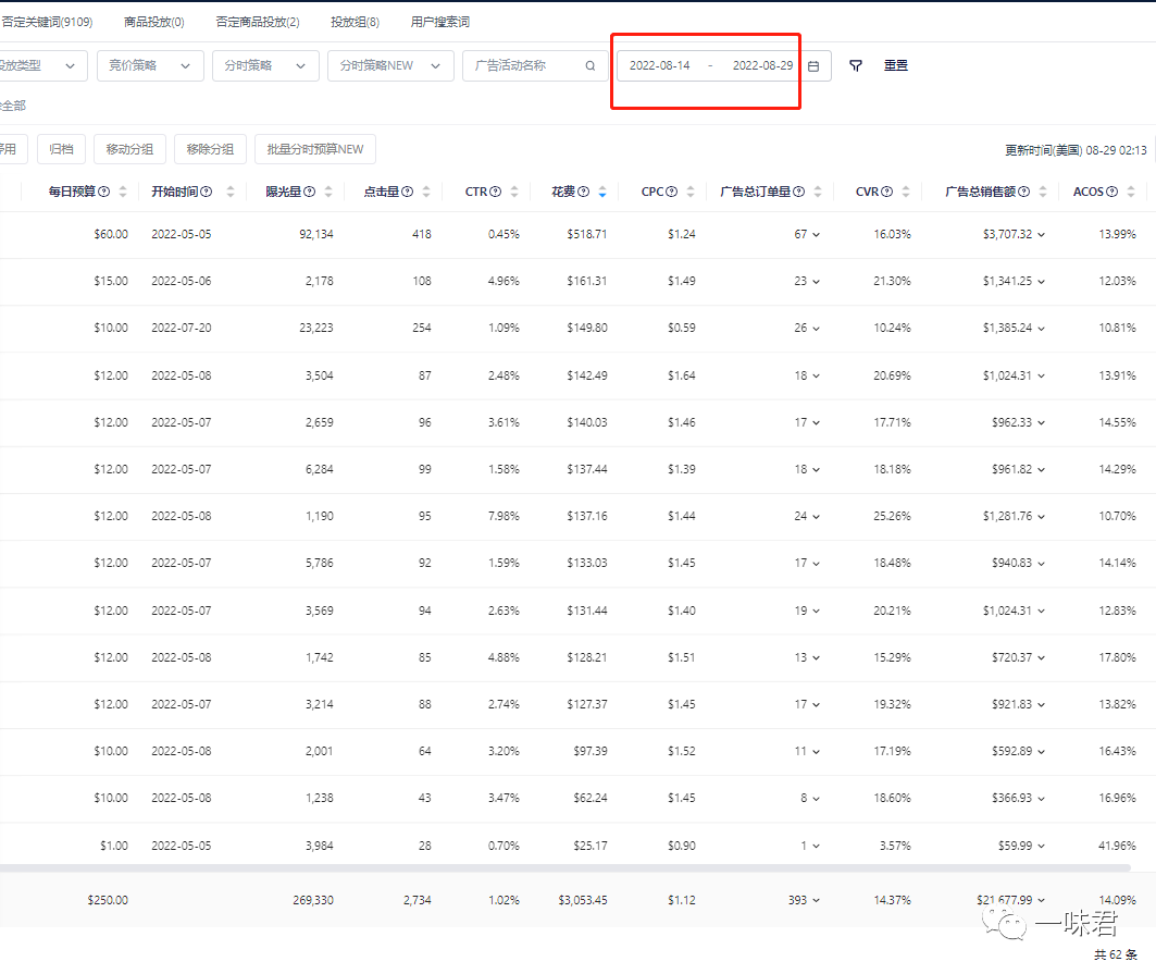 暂停表现很差的广告活动,比如最近30天有曝光有点击没有转化的广告活动,直接进行暂停。