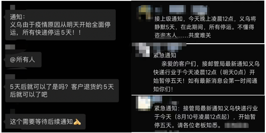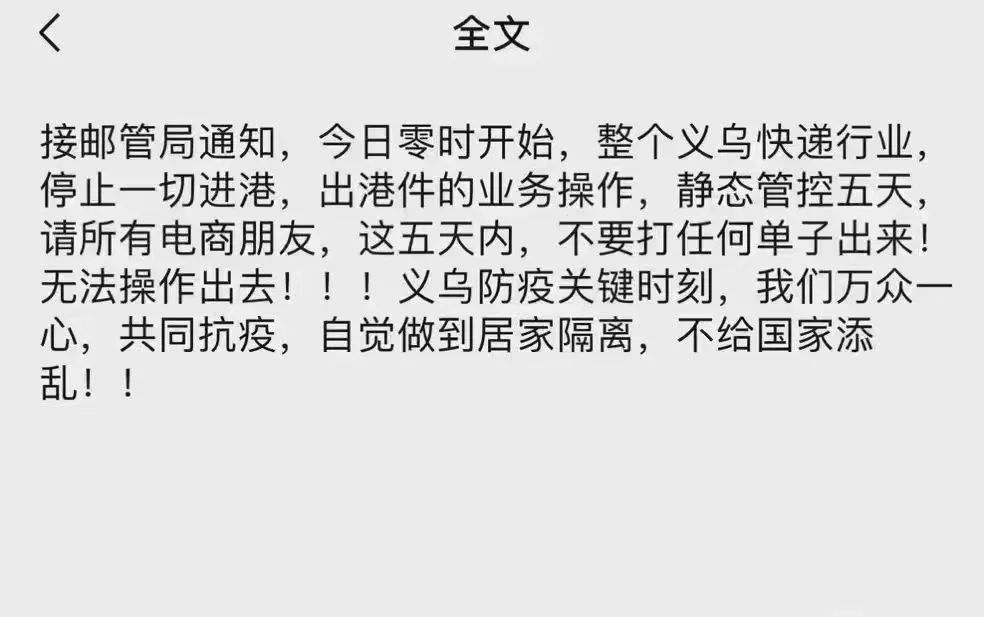 据了解,义乌邮管局也已发出通知,11日零时起,整个义乌快递行业,停止一切进港、出港件的业务操作,静态管控5天。