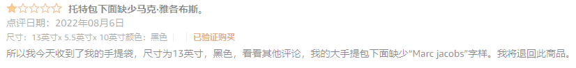 一些买家,都冲着,正品去买,没想到没有标志性的logo,于是在留评"这款手提包缺少Marc Jacobs,我将退回产品 "