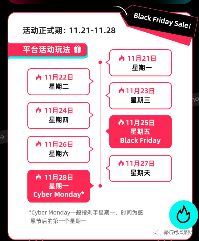 本次TikTok Shop黑五大促活动正式期为11.21-11.28,平台将联动英国、马来西亚、新加坡、菲律宾四国大促资源,加码丰富营销玩法、多重流量补贴扶持,全链路打造强营销生意场景,助推跨境商家生意爆发,撬动品效双赢!