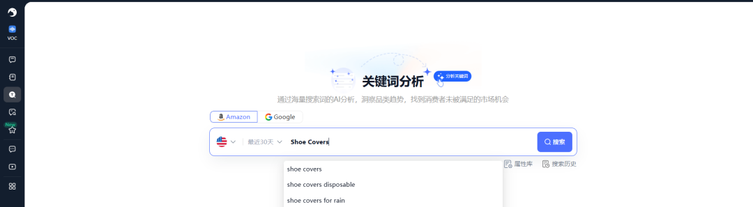 我选择了鞋套这个看似很普通的品类。输入"Shoe Covers"后,系统生成了完整的关键词分析报告,结果真的让我重新认识了这个品类。