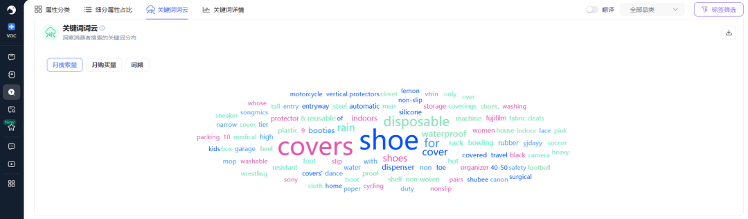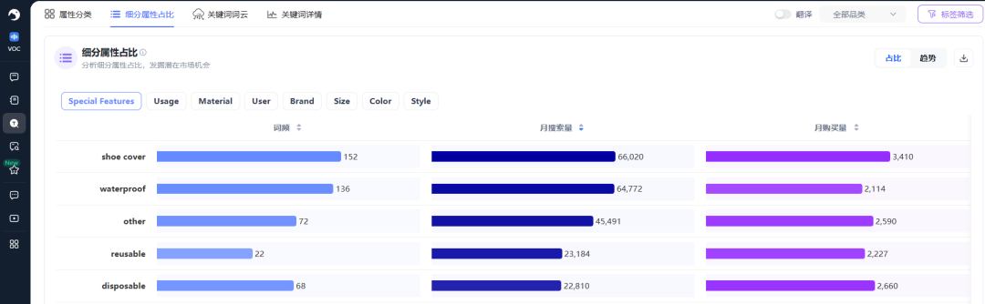为了验证这个想法,我用Shulex VOC AI工具做了一次深度的关键词分析实验。选择这个工具主要是因为它有几个很实用的功能:属性分类分析、细分属性占比、关键词词云分布,还能查看详细的搜索流量和趋势变化。重点是,这些功能普通卖家也能用得起。