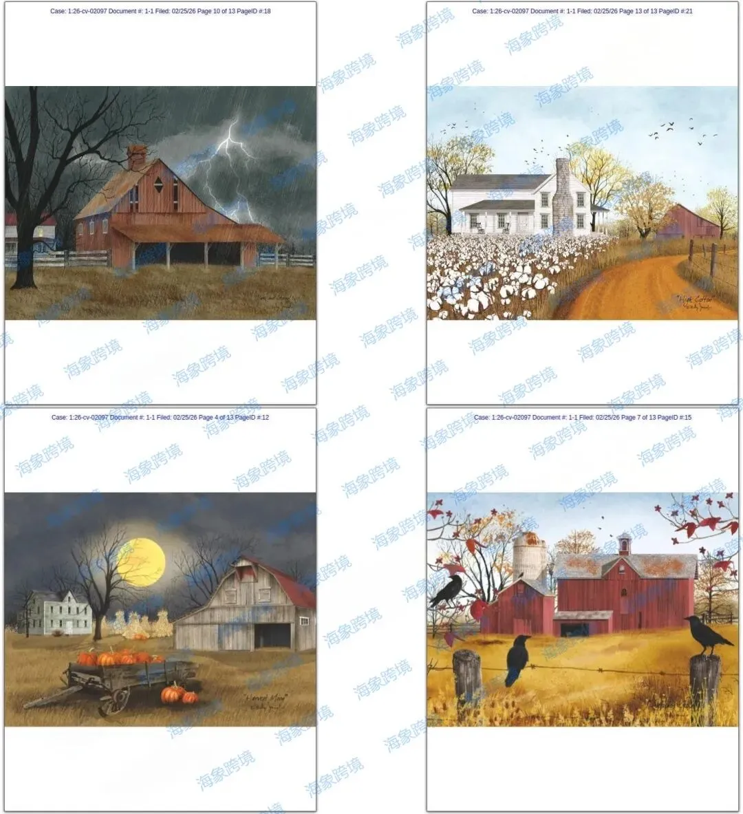 原告 Billy Jacobs 于20世纪80年代初在乡村礼品行业开始了他的职业生涯,担任木工匠人和设计师,创作手工木制品和原始风格的装饰品。到2006年,雅各布斯将他的艺术重心转向绘画,描绘乡村生活场景,包括谷仓、廊桥、教堂、农舍和其他乡村题材。他的作品被印制在各种产品上出售,从装裱画和到餐具和靠垫等家居用品。